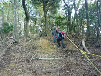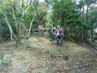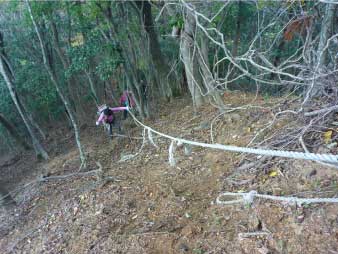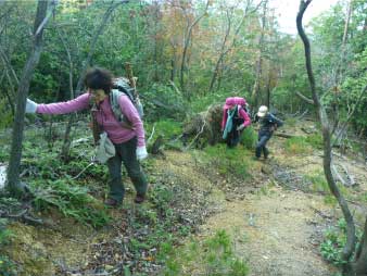 | わずかに踏み跡がある登山道だが、倒木と戦いながら登っていく。標高差は、山の高さ標高266mの登りだ。結構急な登りで、ロープの補助がないと一般のハイカーには厳しいようだ。 |