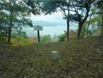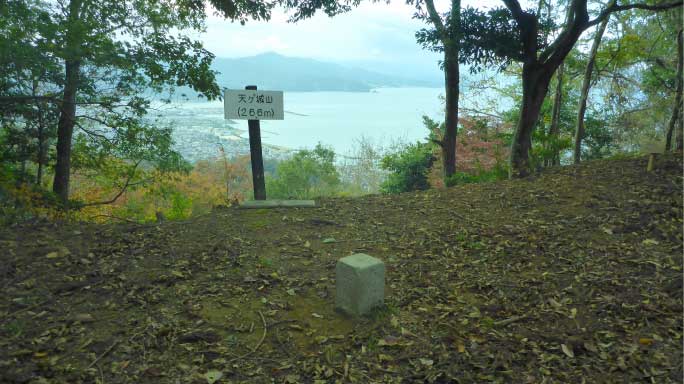天ヶ城山は、標高266mで三等三角点になっている。木々の間から若狭湾、小浜市街を望むことができる。小浜市街の中央に小浜城が見える。 |