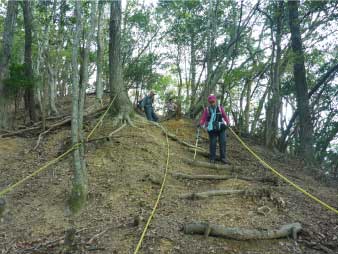| 山頂で景色を楽しんだりして下山開始した。下山をはじめると登りとは違って登山道が必要以上に整備されロープがたくさん張ってある。 |