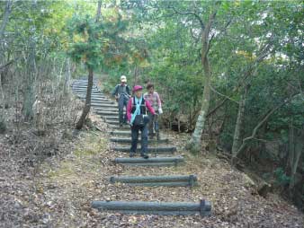 | 羽賀寺分岐を過ぎると登山道は普通の道になり、下っていく。標高195mのピークを過ぎると久須夜ヶ岳が望め、その先よく整備された急な階段道が下へと続いている。 |