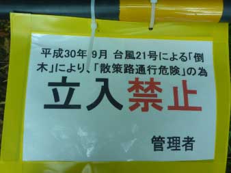 途中で小休止をとり、急な階段を下りきると、登山口に無事下山した。登山口で振り返ると、立入禁止の案内が掲示されていた。下山した先で立入禁止と言われてもどうしようもない。