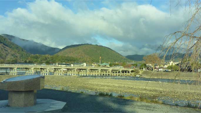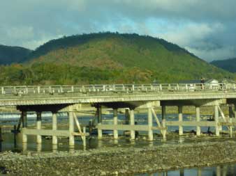 | 12月13日、松愛会山歩きで小倉山に登り、ゆずの里水尾でゆず風呂に浸かり忘年会の予定だ。阪急嵐山駅から出発、中之島公園からこれから登る小倉山を眺め渡月橋を渡った。小倉山の右に愛宕山が見えるのだがあいにく雲の中だ。 | |