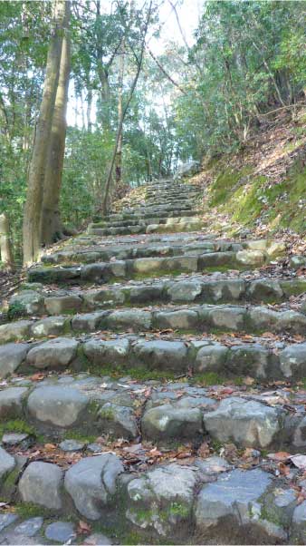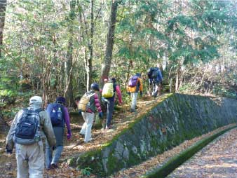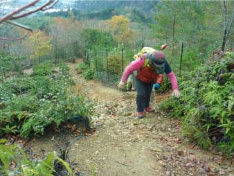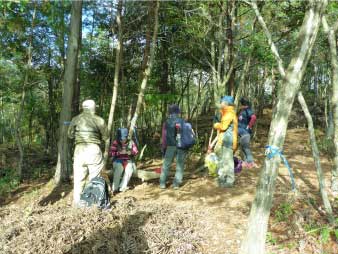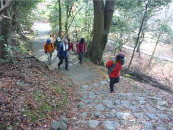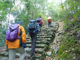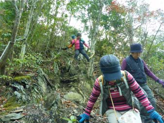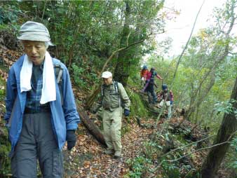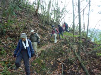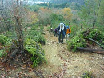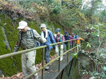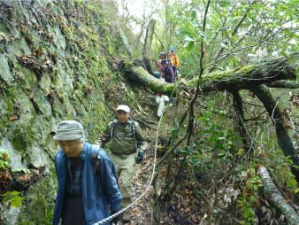 | 崖っぷちの細い道で左下は保津峡まで切れ落ちている。今日一の危険箇所の通過だ。慎重に所々に付けられたロープなどを補助に慎重に進む。 | |