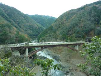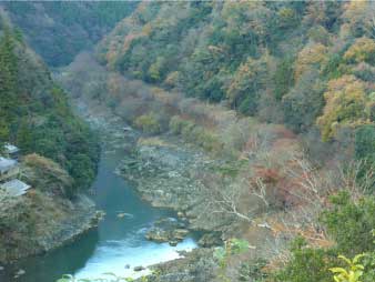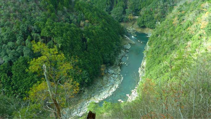 | 展望台から眼下に保津峡が美しく見える。紅葉真っ盛りの頃を想像するとそのころまた訪れてみたい。振り返ると、木々の間に比叡山が美しく見えていた。比叡山は都富士とも呼ばれ素晴らしい。 | |