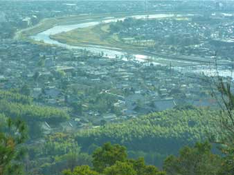 | さらに登ると、京都市街が一望でき、大都会の雰囲気ではなく、都の雰囲気を感じさせる眺望だ。眼下の嵐山を見れば天龍寺などの寺院と曲がりくねった桂川の流れが見える。 | |