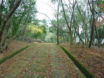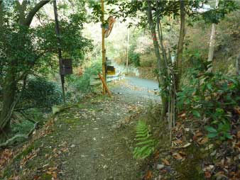 | 展望を楽しみ、さらに登ると、小倉山の山頂とは思えない風景になる。立派な滑り止め付きの舗装された車道に出る。 旧国鉄が山陰線の電化で小倉山トンネルを掘り、その残土がこの山頂に放置された。引き継いだJRは、残土を運び出さず土盛りして植林することで落ち着き、このような山頂になった。 |