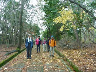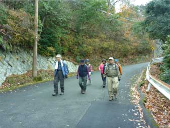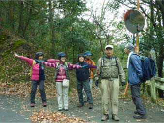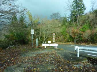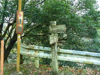 | 山頂をあとに車道に戻り、六丁峠へと下っていった。しばらく下ると右手にガードレールが見えてきた。嵐山・高尾パークウエイにでる。ここからパークウエイの左側の崖沿いに進んでいく。 | |