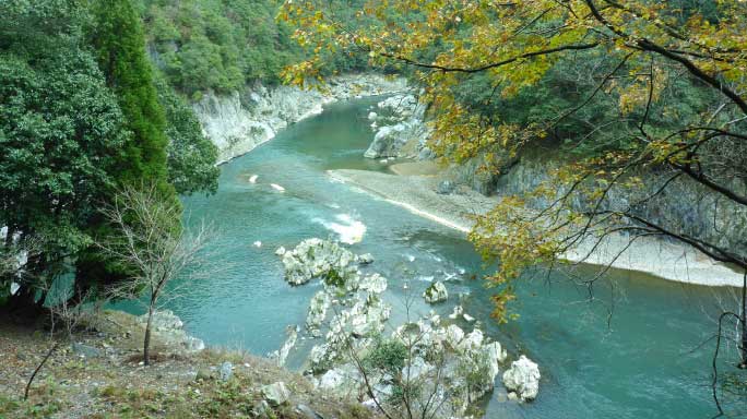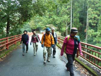 | 絶景を楽しみ少し進むと、前方が開け六丁峠に到着。みんなほっと一息つく。思わずセーフのポーズが出る。 六丁峠から車道を歩き、落合橋へと下る。ここからの保津峡も美しい。橋を渡ってトンネルを抜け、保津峡駅へと歩く。 |