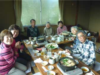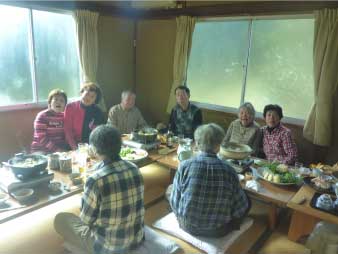| ほぼ予定時刻にJR保津峡に全員無事下山した。お願いしておいた送迎バスでゆずの里水尾のまるげんさんへ。 到着後、ゆずのお風呂に浸かり、ほんのり温まったところで、鍋をつついで忘年会を行った。 |