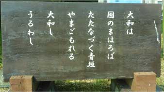 大和は国の中で一番良いところである。幾重にもかさなりあった青い垣根のような山やまにかこまれた大和はほんとうにうるわしいところでありますという意味だそうだ。 |