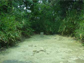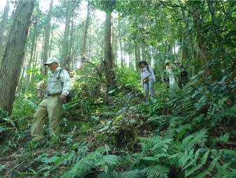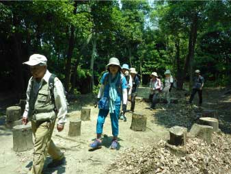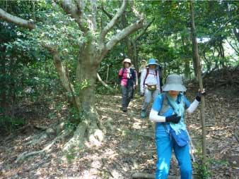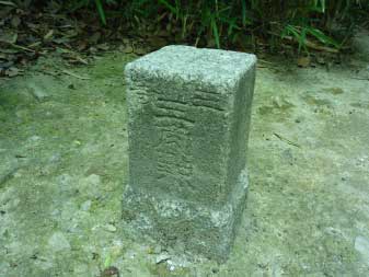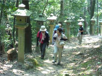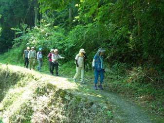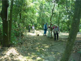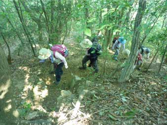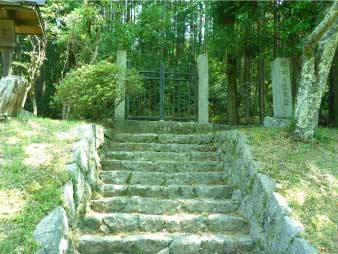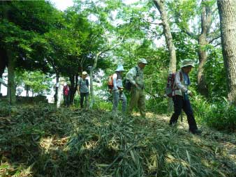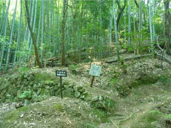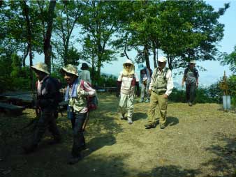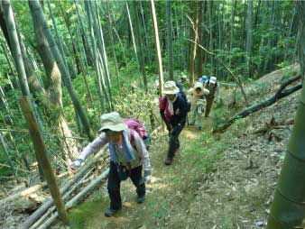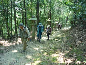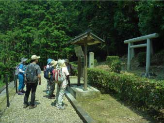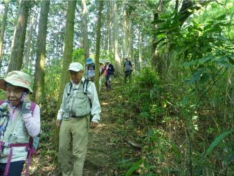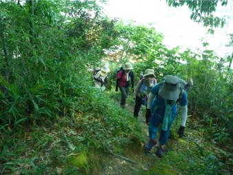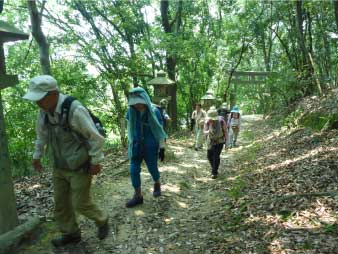 車道から尾根へ急斜面を登る。尾根に出ると竹やぶで、よく整備された登山道が続いている。登山口から15分程登ると、外鎌城址の案内があり、苔むした石垣がその面影を残している。外鎌城址は、南朝の忠臣玉井西阿の最後の砦だったそうだ。さらに少し急な道を10分程登ると、外鎌山の山頂に到着する。 |