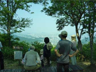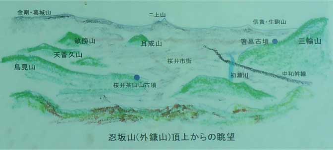 山頂は広く、展望は木々の間から西側に、大和三山、二上山、葛城山、北側には三輪山などが望める。 |