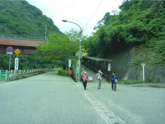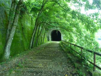 少し先に進むと、次のトンネルに入っていく。長尾第2トンネルで全長147mと少し長いトンネルだ。トンネルを抜けると薄暗い、ほんの少し進むと明るくなり、親水広場に到着する。 |