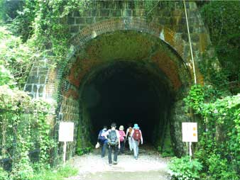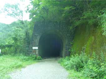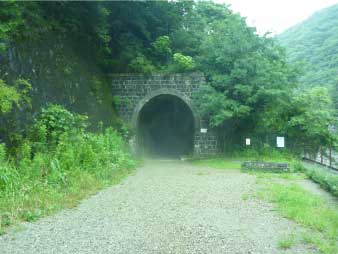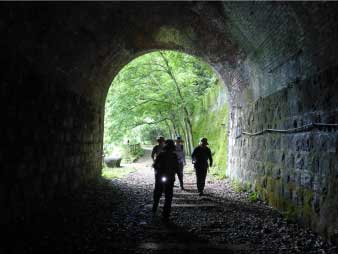 | やがて5つ目のトンネル、北山第2トンネル全長413mになる。このトンネルが今回の一番長いトンネルだ。真っ暗なトンネルの枕木やバラストを踏みながら進んでいく。真っ暗な中なので平衡感覚を保つのがなかなかむつかしい。 |
