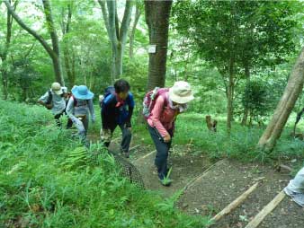 | 急な桜坂を一気に登ってもいいのだが、遊歩道の休憩ベンチでお水をいっぱい、熱中症対策だ。再び登ると東屋に到着する。育樹の丘と名付けされた斜面だ。 |