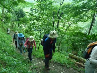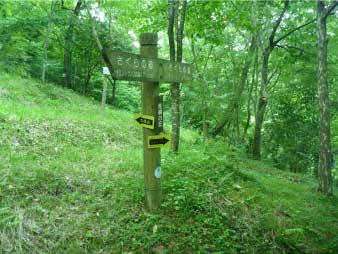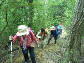 | 天候が不安定で、雨が降りそうだがなんとか夕方まで持ちそうな感じだ。大峰山の往復を決意して、さくらの道を進んだ。一旦沢に降りて急坂、桜坂というそうだが登っていく。 |