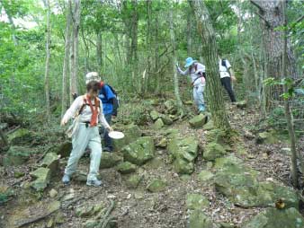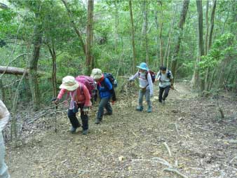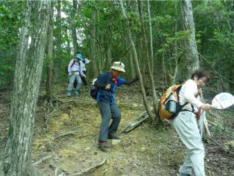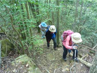 | 基準点を過ぎると、急登になってくる。標高450m辺りまでかなり急な道が続き、少し緩やかになり山頂らしきピークが見える。残念ながら手前のピークでそこから先は結構遠い。ピークを越えて緩やかな長い登り道を登り返すと、大峰山の山頂に到着する。 |