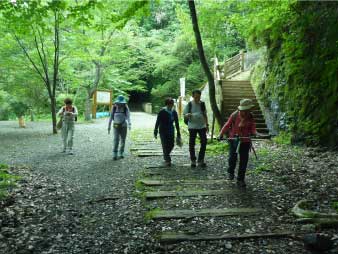 城ケ丘広場という、桜の古木がある広場に出た。さらに急坂を下っていくと、やがて沢沿いの道になり、登山口の親水広場に無事下山した。