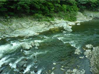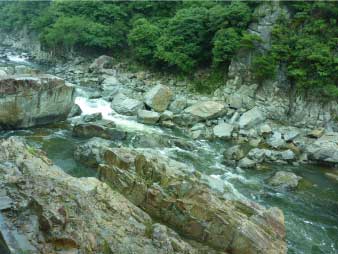 | 武庫川第2橋梁を渡るとすぐ、横溝尾トンネル全長149mに入っていく。トンネルを出ると左側は武庫川渓谷でしばらく武庫川渓流を楽しみながら廃線敷を歩いていく。 |