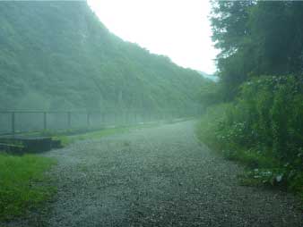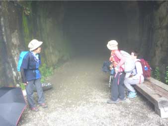 トンネル入口で天気が少し怪しくなってきた。ゆっくりして最後のトンネルに入る。トンネルを出ると前方には雨雲が迫ってきたいる。通り雨だと思うが出口で少し休んで先に進めた。トンネルを振り返ると、霧が掛かってもやってきていた。 |