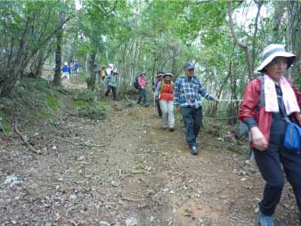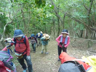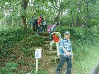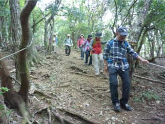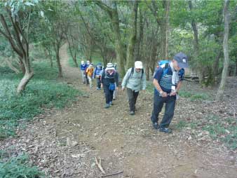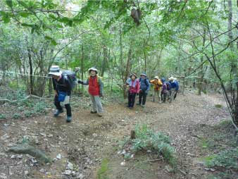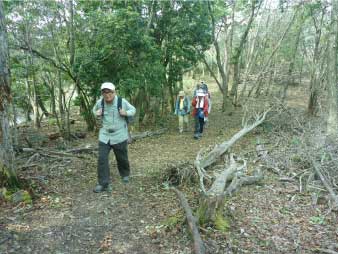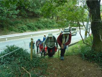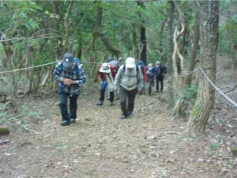 | 登り時急だった坂は、下り時は滑りそうで慎重に下る。ロープもあり、補助にしながら必死で下る人も、登山口に全員無事下山し、るり渓温泉に戻った。 |