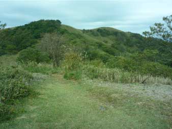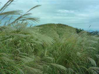 | ピークから一旦下り登り返したピークを過ぎると、次のピークが見えてくる。そのピークを目指してススキの草原を楽しく歩き、登りきる。 |