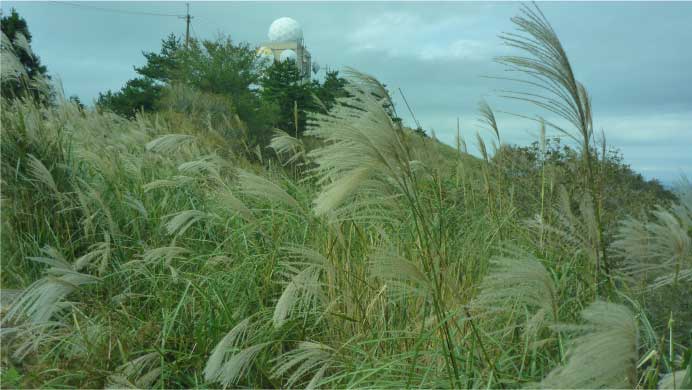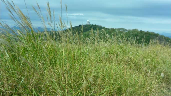 | ススキの原っぱを時々かき分けながら進んでいく。標高755mのピークに到着、周囲の景色を眺めながら小休止。眼下には、ゴルフ場が広がり、正面には山頂が見えるかと思ったらレーザーアンテナがないのでまだこの尾根の向こうのようだ。 |