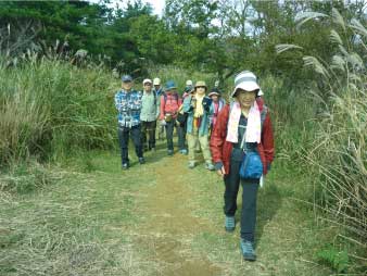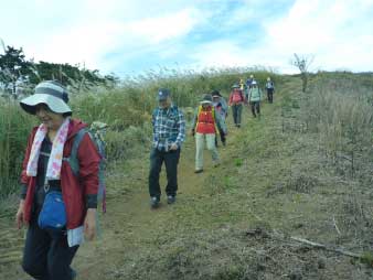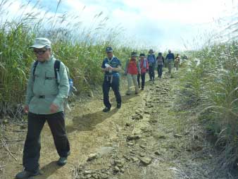 | 昼食、景色を楽しんで山頂をあとに往路を下山した。ススキを楽しみながら下っていく。登りは静かだったが下りは元気いっぱいだ。 |