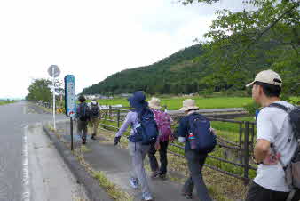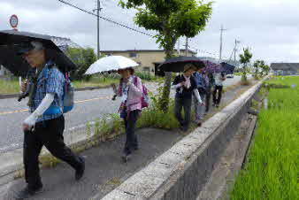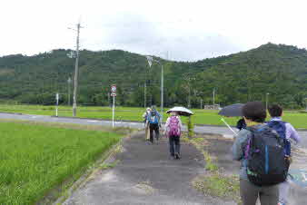 | 休憩をしているうちに雨も止んだので天神社、龍王寺の前を通って、川守BSと歩いた。後ろを時々振り返ると、今登ってきた雪野山が美しく見える。 |