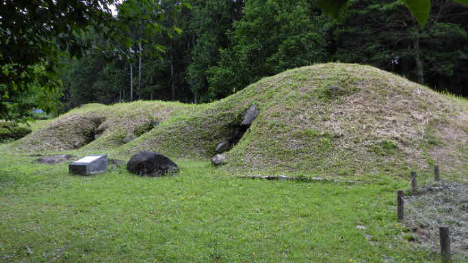 | フェンスの向こうに古墳がたくさん見えてきた。まず3つの石室が続いた古墳が目に入る。八幡社46号墳は、前方後円墳で3基の横穴式石室があり、墳丘が21mほどあり大きい規模の古墳だ。近くに41号墳が石室の天井や墳丘がなく表に出ている。 |