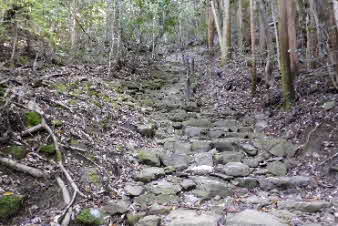 | 5分ほど広い道を登っていくと石段の急な登りになり、気合を入れるとすぐ十一丁の丁石があり、山頂まで十一丁こんな登りが続くんだろうか。 |
