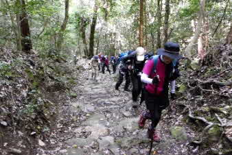 | 丁石の数字が減ってくるのを励みにしながら登ってくると、八丁石を通過する。登山口から標高差100mを登ってきた。六丁峠まであと二丁、標高差で40mがかなり厳しくなってきて列も長くなってきた。 |