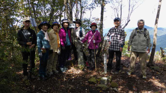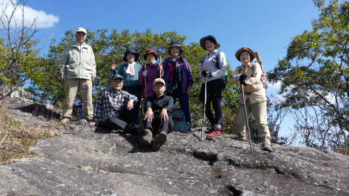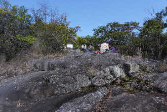 山頂から南に伸びる尾根を少し下ると展望台になっている。さらに下ると展望岩になっている。ここで展望を楽しみながら昼食にした。予定日は雨だったが順延した今日は、小春日和のぽかぽか天気で楽しい食事タイムになった。