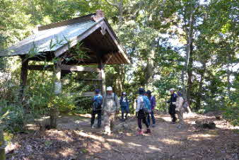 | 昼食後山頂から少し下ると、観音堂があり、お参りする。山頂に戻ると、鐘堂があり、鐘をありがたく衝かせていただく。 |