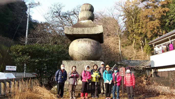 京阪石清水八幡宮駅に集合して、9時過ぎに出発、最初は航海記念塔に立ち寄った。鎌倉時代に航海の安全を祈って石清水八幡宮にお参りし、この五輪塔がつくられたそうだ。航海の無事にあやかって新型コロナウイルスが早くおさまってくれるよう祈願した。 |