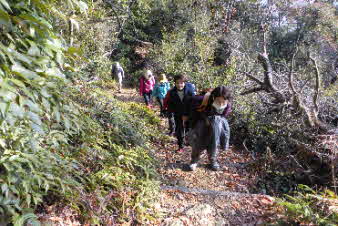 | 竹林が過ぎると、雑木林になり明るくなる。少し急坂を登りきればまもなく山頂だ。途中で衣服調整してさらに登るとやがて山頂に到着する。 |
