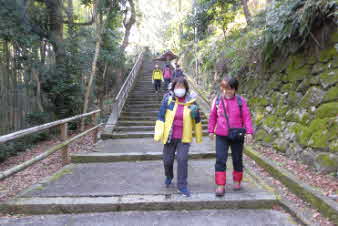 | 石清水八幡宮に参拝せ、展望台で景色を楽しみ、裏参道の石段を下り、一の鳥居へと戻った。このあと、例年楽しみの新年会だが、今年は残念ながら新型コロナウイルス感染予防から中止にした。 |