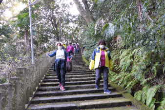 | 尾根頭まで登ると、少し展望があり、足の下にはケーブルカーのトンネルになっている。ここで迎えてくれたのはスイセンの可愛い花だ。っこからしばらく竹林の道を登っていく。 |