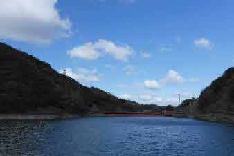 大きな堰堤が現れ大きな池が広がってくる。新滝ノ池で周囲に遊歩道があり、広い池と青空が素晴らしい。池に沿って上流へと進んでいく。
