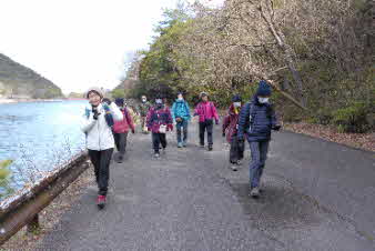 池の南端から林道の登りになり、今までほぼ平地を歩いてきたので少し面食らう感じだ。左に新池を木々の間から見え隠れ、登り切ると、滝ノ池の北橋近くの広場に到着、食休止にする。滝ノ池の南先に円錐形の山があり、山頂に日の丸が揚っている。山名はよくわからないが、麓に青少年の森があるので、火ノ山(於武登)だろうと思う。機会があれば登ってみたい。 |