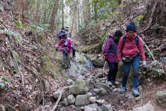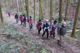 | お菊山でゆっくりして新家(しんげ)駅へと下山した。尾根筋に沿って30分ほど下り、その先、谷へと下り高度を下げ荒れた沢道を下り終えると、林道に出る。ここから新家駅まで約3km舗装道路をひたすら歩いてJR新家駅に全員無事到着。 |