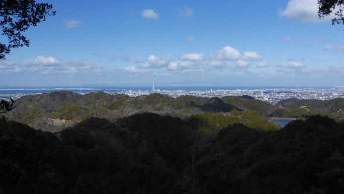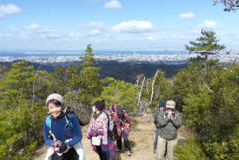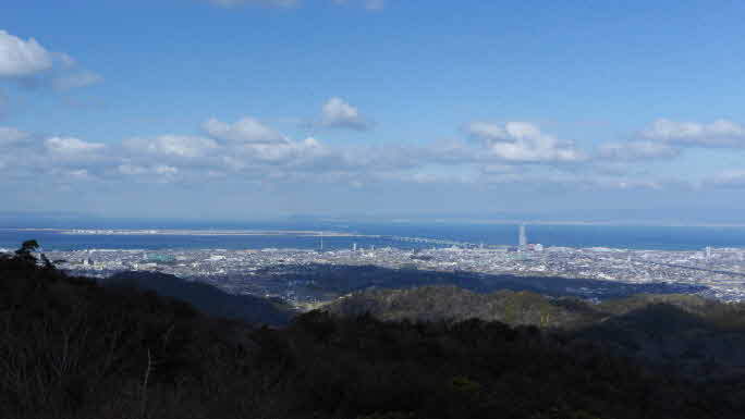 | 細い尾根は馬ノ背と呼ばれているようで日差しを浴びた雑木林を楽しく登って行く。尾根に出て20分ほどすると、右側が開けてきて関空、泉南、泉佐野市街が眼下に広がり素晴らしい大パノラマだ。 |