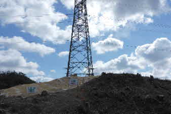 | 次の鉄塔は工事していなく、陽が差していて風が弱そうなのでここで昼食にした。工事の人が時々往来しているが、古くなった鉄塔近くに新しい鉄塔を造り、建て替え工事だそうであと数年はかかるとか。 |