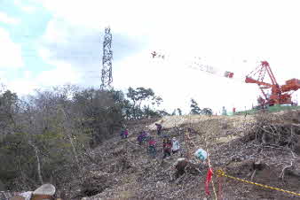 | 昼食をすませ先に進む、さっそく工事中で工事の淵を巻いて迂回して先に進む。木々の間から鉄塔で作業しているのが見えるがこんな寒い長危険な作業は大変ご苦労様だ。 |