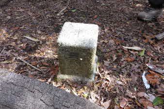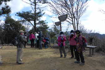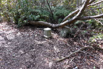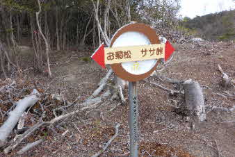 | 昼食後20分で三角点への脇道入っていく、脇道を1分あまり行くと小さなピークに三角点がある。お菊山の三角点で三等三角点、標高354m、点名は「於菊松」だ。 |