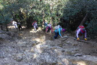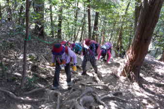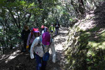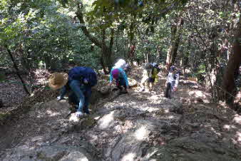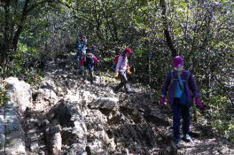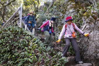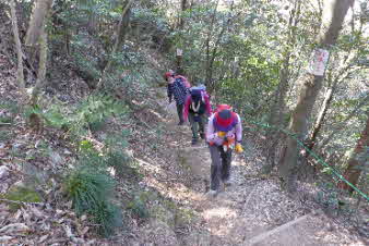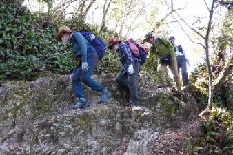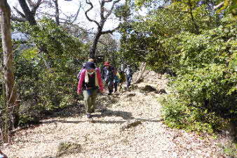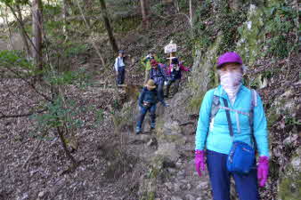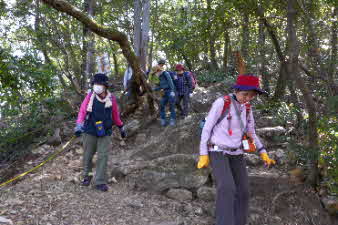 | 山頂でゆっくりして、めい想の径を下ることにした。御嶽神社横から急な下りが始まる。かなり厳しい下りが続く。さすが難攻不落と言われただけあって厳しい岩稜の山だ。攻めるのも難しいかもしれないが、食料や物資をどのようにして持ち上げたのか、きっと大変だっただろう。 |