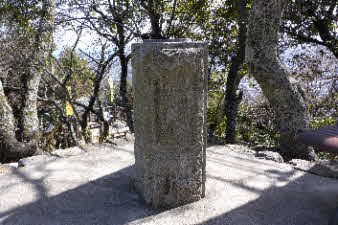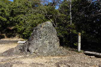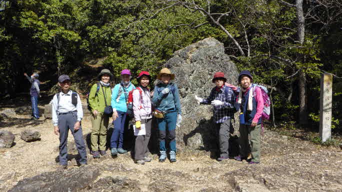 | ツヅラ折れの道を登っていくと、丸山という広場に到着、背丈以上の烏帽子岩が中央にあった。めい想の小道は麓を巻いているが、今日はここから尾根道に入り、馬ノ背登山道を登ることにした。 |