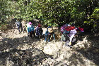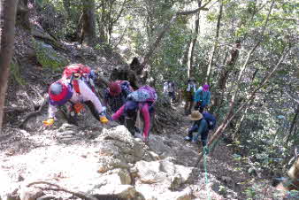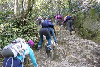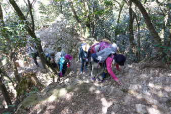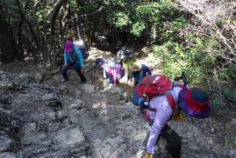 | 烏帽子岩から馬ノ背登山道を登り始めると、ほどなく岩の尾根になってくる。岩尾根の登りも次第に急登になってくる。所々に緩やかな尾根があるがみんなホッとしている感じだ。 |