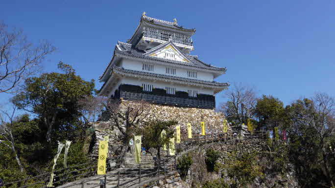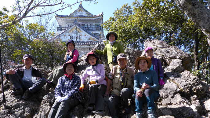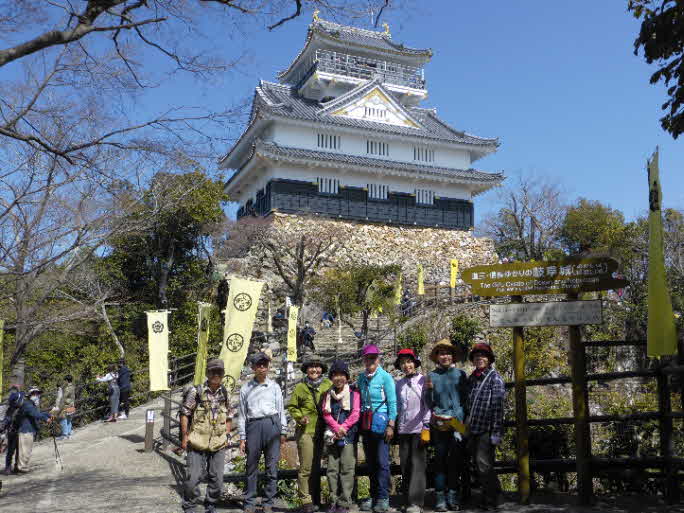 | 3月18日、山歩き会で18切符を使って岐阜県の金華山に行った。京都8時20分に新快速で米原へ、大垣行きに乗り換え、大垣でまた乗り換えて岐阜駅に10時過ぎに到着した。岐阜駅前からバスに乗り岐阜公園へ、バスを降りると金華山が見え山頂に岐阜城が見える。これから岐阜城に登城だ。 |