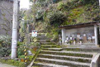 大師堂をあとに薬師堂へと下っていく。ここの山道にも石仏が各所にお祀りしてある。急坂を下り、ロープウエイの下を通って下ると、温泉寺に到着する。